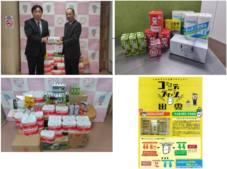 2025年12月17日(水)に出雲市社会福祉協議会、2025年12月19日(金)NPO法人しまね子ども支援プロジェクト「コミュニティフリッジ出雲」(持込先は出雲市総合ボランティアセンター)にファン感謝デーの未交換品と贈答品等を合わせ計452点の食品・日用品を寄贈しました。今回、寄贈した食品・日用品は出雲市社会福祉協議会・コミュニティフリッジ出雲を通じて生活に困窮されている方に届けられます。